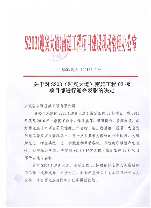 S203(迎賓大道)南延工程03標(biāo)獲業(yè)主通令表彰
