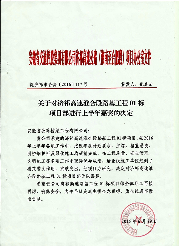 近日,濟(jì)祁高速淮合段項(xiàng)目辦對公司承建的濟(jì)祁高速淮河橋項(xiàng)目予以嘉獎,表彰該項(xiàng)目在2016年上半年工程質(zhì)量、進(jìn)度方面取得的佳績。其中特別指出,淮河橋項(xiàng)目嚴(yán)格按照業(yè)主年度計(jì)劃要求,主塔、掛籃懸澆、引橋鋼護(hù)欄及綠化施工均超前完成,同時(shí)在安全管理、文明施工等多項(xiàng)工作中也取得優(yōu)異成績,給全線施工單位起到了模范帶頭作用。