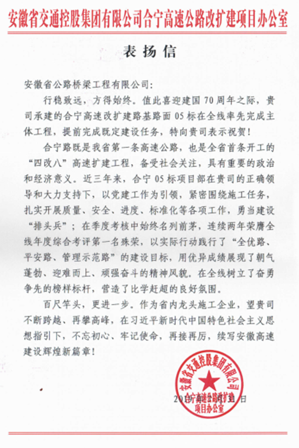 近日,合寧05標(biāo)項(xiàng)目部收到項(xiàng)目辦發(fā)來的表揚(yáng)信,對項(xiàng)目全線率先完成主體工程建設(shè)任務(wù)表示祝賀,對項(xiàng)目團(tuán)隊(duì)管理水平、工程形象進(jìn)度等工作給予了表揚(yáng)。
