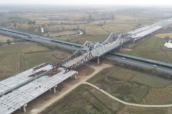 滁州大道項(xiàng)目鋼桁梁半幅頂推施工完成