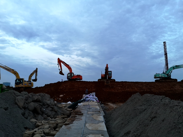 巢湖市東外壞旗山撇洪溝,位于巢湖鼓山腳下,連接清溪河支流,連日降雨,清溪河水位暴漲,防汛壓力巨大,經(jīng)開區(qū)的人民生命和財(cái)產(chǎn)安全受到嚴(yán)重威脅。經(jīng)巢湖市政府研究決定,在旗山撇洪溝和清溪河支流交匯處筑壩,將撇洪溝東側(cè)低洼處作為清溪河支流泄洪預(yù)備區(qū),以應(yīng)對(duì)清溪河水位暴漲危險(xiǎn)。接到汛情指令,巢湖市亞父路項(xiàng)目部迅速出動(dòng),組建防汛突擊隊(duì),調(diào)集挖掘機(jī)、裝載機(jī)等機(jī)械設(shè)備迅速奔赴搶險(xiǎn)一線,連續(xù)奮戰(zhàn)兩天三夜,填筑黃土近10000方,碎石1500方,拋石700噸,圓滿完成了底寬22米,上寬10米,高5米,長110米的筑壩任務(wù),確保了經(jīng)開區(qū)的人民生命和財(cái)產(chǎn)安全。