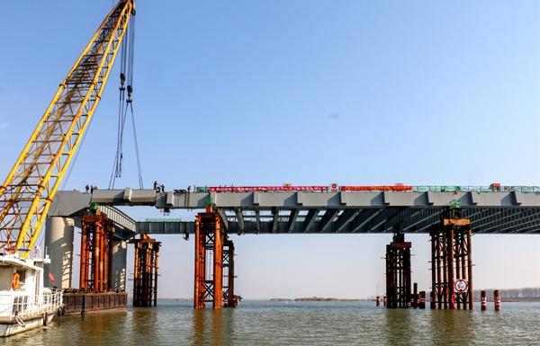 固蚌高速02標澮河特大橋主橋鋼梁順利合龍