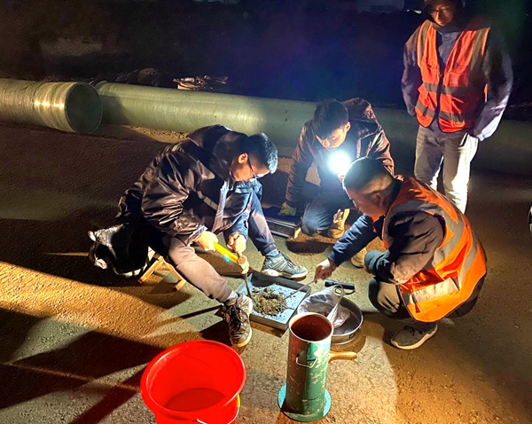 由于該項目施工區(qū)域位于交通干道,車輛、人員流動量大,道路兩旁住房、廠房密布,大規(guī)模作業(yè)無法實施。針對種種困難和壓力,項目部精心謀劃,組織精干力量,分重點、分區(qū)域、分節(jié)點,采用“插縫施工”思路,以點帶面,以面促片,順利完成路床交驗、路面水穩(wěn)試驗段鋪筑、污水管道施工和全線舊路面板破除等節(jié)點任務(wù)。