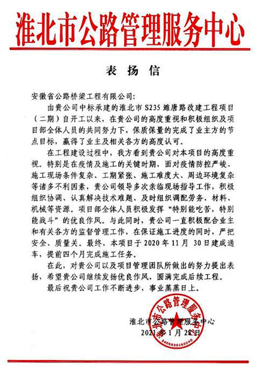 1月28日,淮北市公路管理服務(wù)中心向公司發(fā)來表揚信,對淮北S235項目團隊保質(zhì)保量提前完成施工任務(wù)給予表揚。