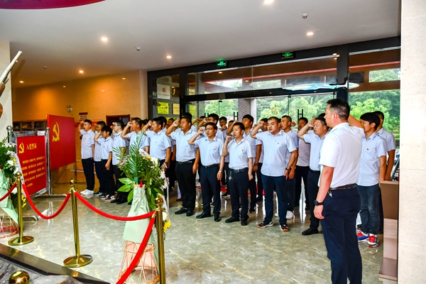 在池州市烈士陵園紀(jì)念館內(nèi),全體黨員在革命烈士塑雕正前方肅立,舉行敬獻(xiàn)花籃儀式并默哀,表達(dá)對(duì)烈士的深切緬懷和無(wú)限敬仰。在黨總支書記王秋華領(lǐng)誓下,大家面對(duì)鮮艷的黨旗,集體重溫入黨誓詞。G318項(xiàng)目青年突擊隊(duì)成員代表分公司全體團(tuán)員青年,面向團(tuán)旗進(jìn)行宣誓,結(jié)合正在進(jìn)行中的勞動(dòng)競(jìng)賽作出承諾。榮獲集團(tuán)優(yōu)秀團(tuán)員青年表彰的楊毅作了先進(jìn)事跡交流。