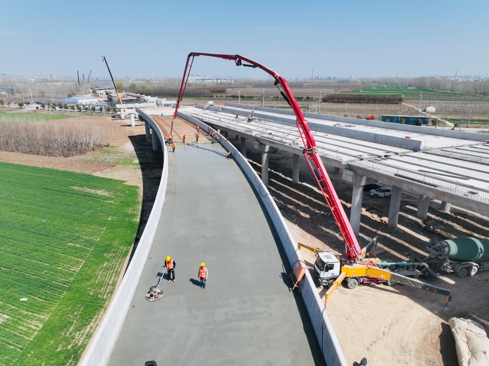 “3月21日,隨著劉橋互通橋面鋪裝首件工程成功澆筑,標(biāo)志著徐淮阜高速(淮北段)橋面系鋪裝施工拉開序幕?!?月1日,安徽路橋徐淮阜高速(淮北段)路基路面標(biāo)項(xiàng)目副經(jīng)理周邵鵬說,徐淮阜高速公路(淮北段)項(xiàng)目共有33座橋梁,其中特大橋2座,分別是劉橋互通和沱河特大橋,劉橋互通采用A型單喇叭方案設(shè)計(jì),橋面鋪裝首件位于劉橋互通D匝道橋第一聯(lián),澆筑長100米、寬9米,攤鋪厚度8厘米,采用C50防水混凝土。