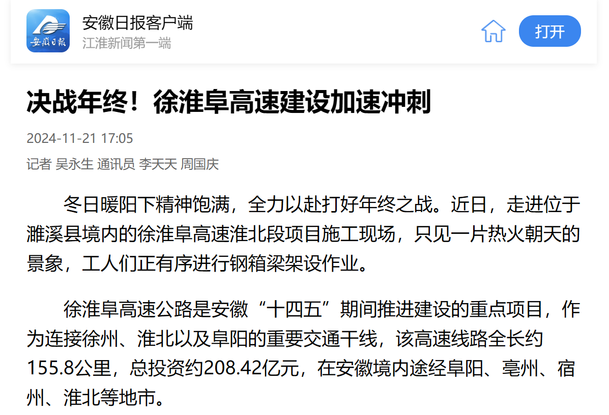 【名媒聚焦】安徽日?qǐng)?bào)客戶(hù)端、學(xué)習(xí)強(qiáng)國(guó)、淮北日?qǐng)?bào):決戰(zhàn)年終!徐淮阜高速建設(shè)加速?zèng)_刺