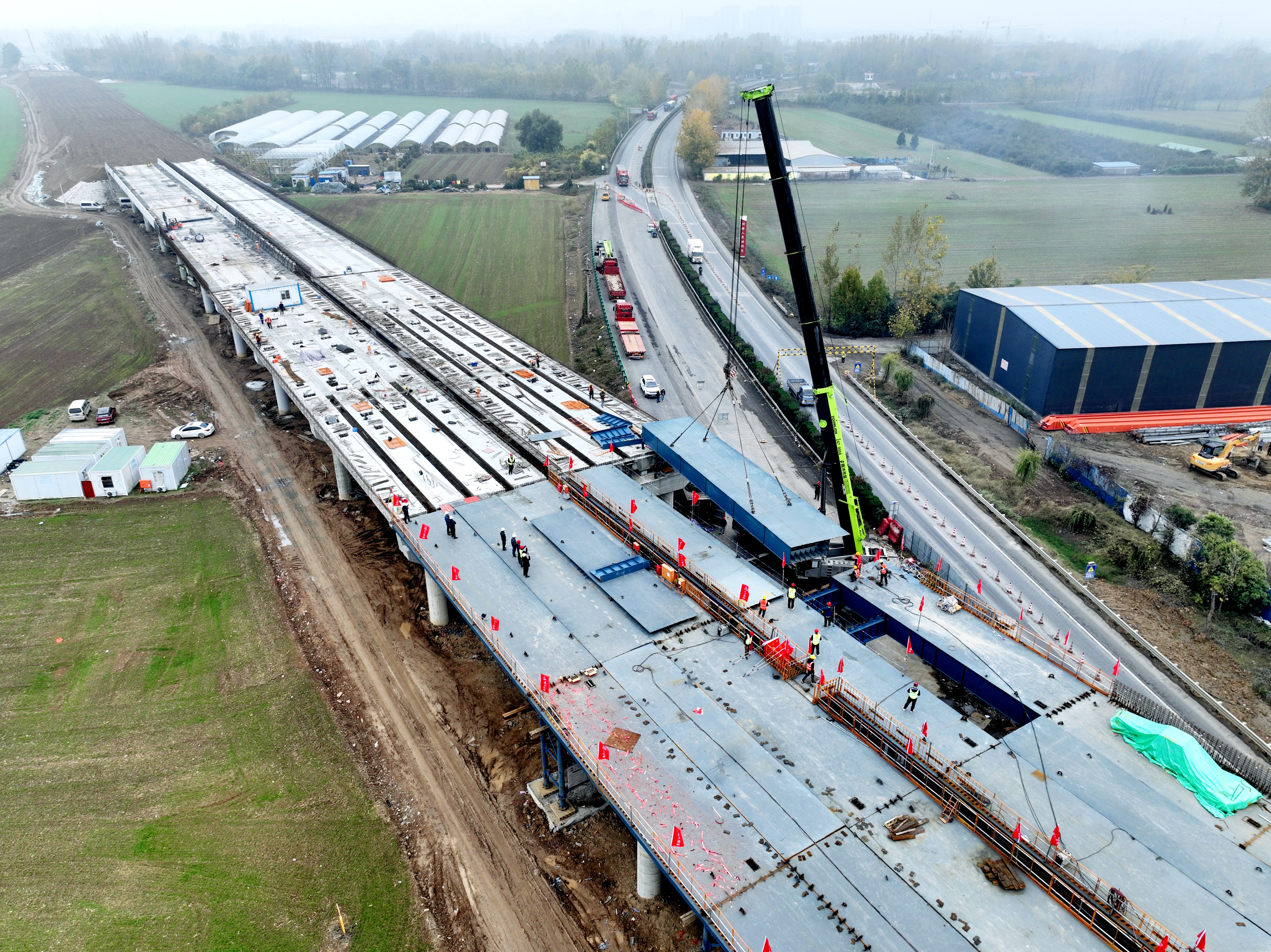 記者在現(xiàn)場(chǎng)了解到,11月以來(lái),淮北段項(xiàng)目實(shí)現(xiàn)多個(gè)重要節(jié)點(diǎn)突破,先后完成K71+462車(chē)行天橋、K46+814.5大廟溝橋、K40+647.6洪堿河大橋3座橋梁下部結(jié)構(gòu)施工,上跨臥龍湖煤礦鐵路橋、K43+681規(guī)劃G237分離立交橋、K42+794中橋三座橋梁橋面系及附屬工程施工,項(xiàng)目重點(diǎn)控制性工程K50+162.5跨S303分離立交橋鋼箱梁的全部架設(shè),目前正全力沖刺確保11月底前完成全線橋梁下部結(jié)構(gòu)施工的節(jié)點(diǎn)目標(biāo)。