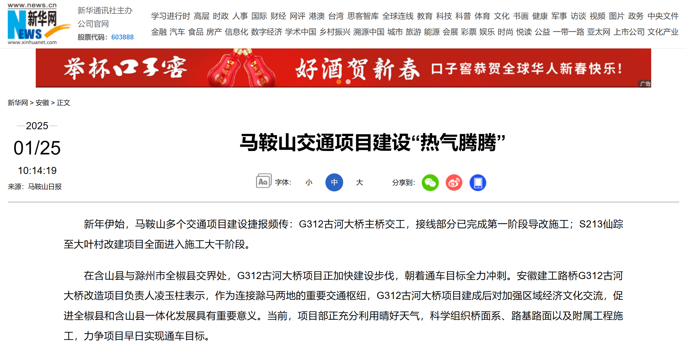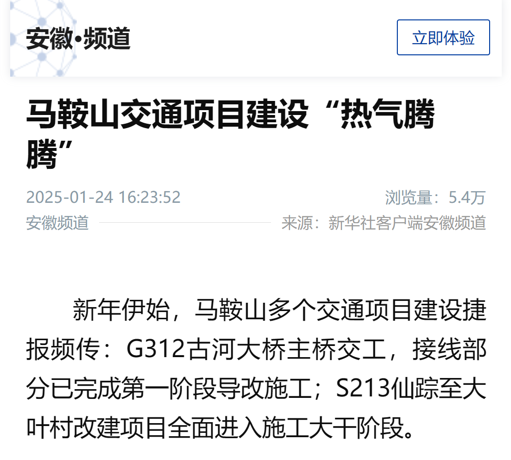 新年伊始,馬鞍山多個交通項(xiàng)目建設(shè)捷報頻傳:G312古河大橋主橋交工,接線部分已完成第一階段導(dǎo)改施工;S213仙蹤至大葉村改建項(xiàng)目全面進(jìn)入施工大干階段。