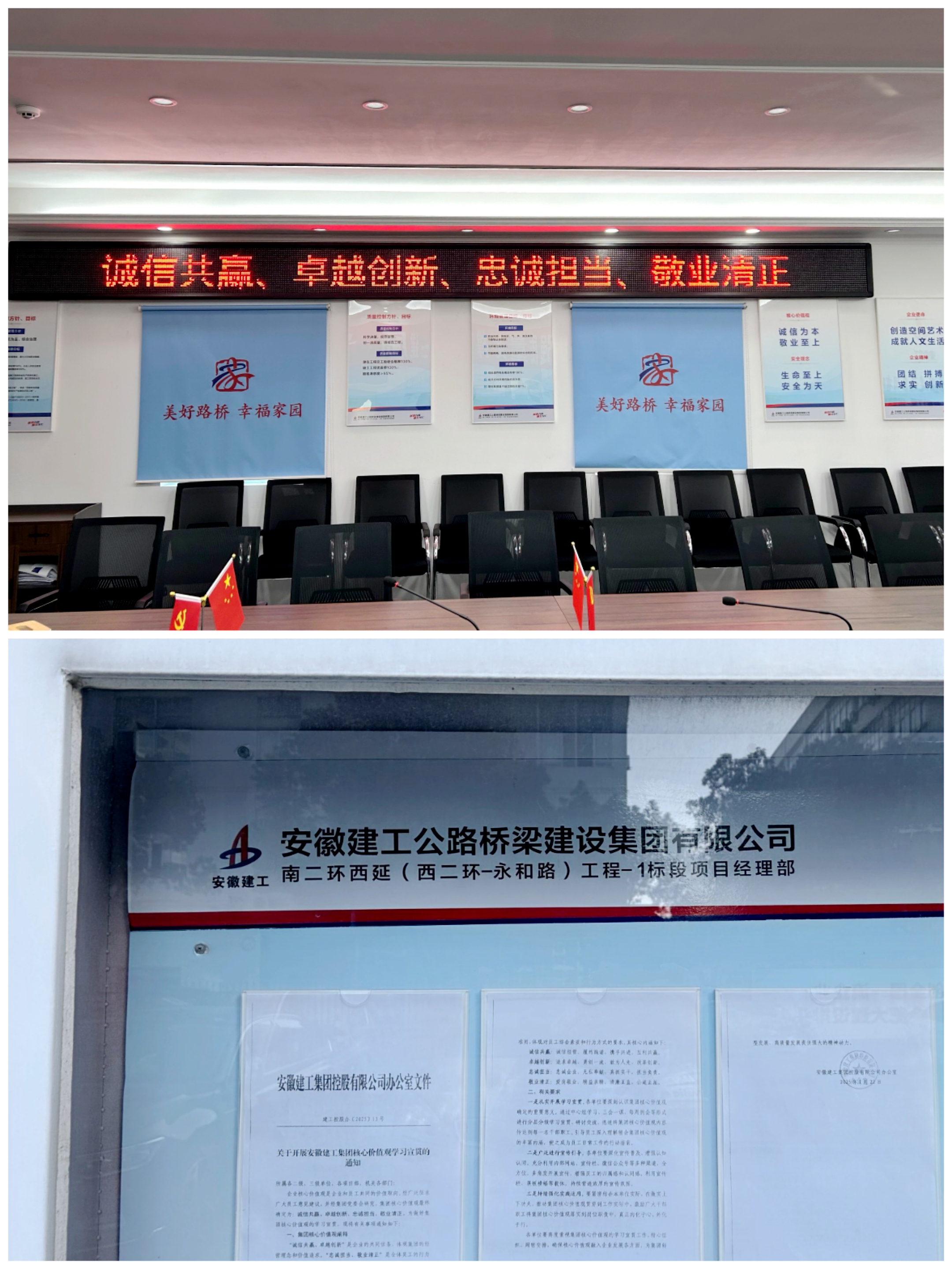南二環(huán)西延項(xiàng)目利用電子屏和駐地宣傳欄對(duì)集團(tuán)核心價(jià)值觀進(jìn)行宣傳,營(yíng)造良好氛圍。