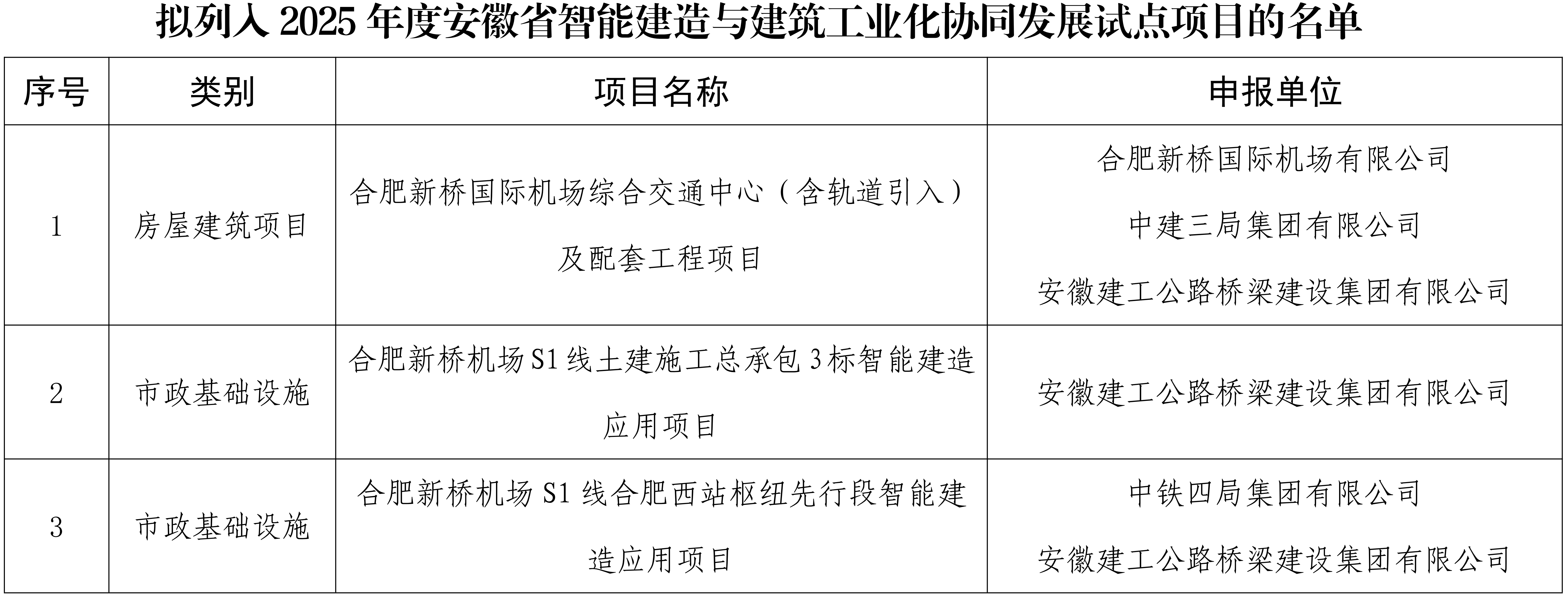 近日,安徽省住房和城鄉(xiāng)建設(shè)廳公布了2025年度安徽省智能建造與建筑工業(yè)化協(xié)同發(fā)展新技術(shù)新產(chǎn)品及試點項目,公司“新橋機場S1線土建施工總承包3標(biāo)”、“新橋機場S1線合肥西站樞紐先行段”、“合肥新橋國際機場綜合交通中心(含軌道引入)及配套工程”三個項目,“人工智能和物聯(lián)網(wǎng)感知技術(shù)在復(fù)雜施工環(huán)境安全管理中的應(yīng)用”、“GIS+無人機自動巡檢系統(tǒng)”等兩項產(chǎn)品應(yīng)用成功入選。