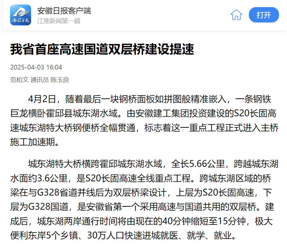 安徽建工S20長固高速路基01標工區(qū)負責人經云介紹,城東湖特大橋橫跨城東湖水域,全程5.66km,是安徽省首個采用高速與國道共用雙層橋跨越湖泊項目,其中上層為S20長固高速,下層為G328國道。