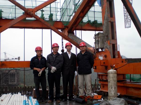 31日上午,在經(jīng)過整夜大雨后,天空依舊飄散著涼涼的細(xì)雨。盛總一行在項(xiàng)目總工胡學(xué)祥和項(xiàng)目副經(jīng)理張林的陪同下,對(duì)巖子腳大橋進(jìn)行了認(rèn)真的檢查,并冒雨登上高達(dá)74米的4號(hào)主墩施工現(xiàn)場(chǎng)。他就進(jìn)行到掛藍(lán)施工階段的大橋與項(xiàng)目人員展開討論,對(duì)施工現(xiàn)場(chǎng)存在的施工難點(diǎn)和注意事項(xiàng)一一指出。盛總對(duì)項(xiàng)目部克服種種困難加緊施工作出了肯定。