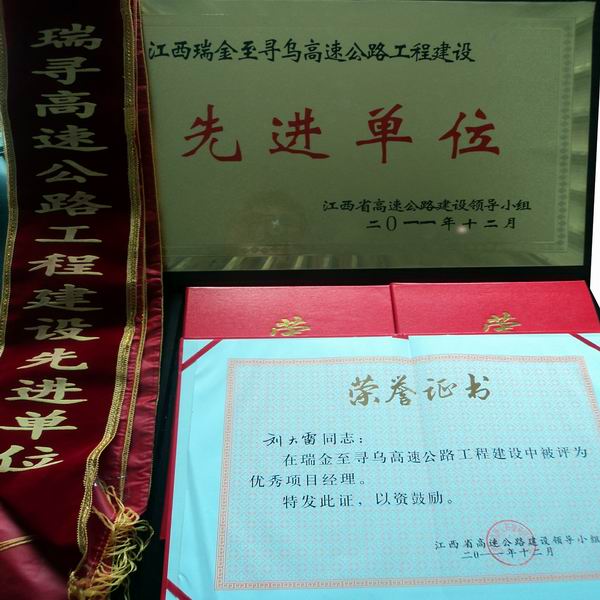 公司承建的瑞尋A7標在公司的正確領導下,在以劉大雷同志為首的項目全體員工的共同奮斗下,經(jīng)過兩年的頑強拼搏、艱苦施工,終于實現(xiàn)了瑞尋高速公路的建成通車,在贛南大地描繪了一條絢麗的彩虹,書寫了一幅質優(yōu)、安全、廉潔、環(huán)保的壯麗畫卷。瑞尋A7標以工程質量更優(yōu)、外觀形象更美、生態(tài)環(huán)境更佳、依法管理更嚴、安全廉潔更好為要求,以抓細節(jié)、樹精品、講程序、促規(guī)范、善創(chuàng)新、爭一流為管理理念,取得了一系列的優(yōu)異成績。在項目辦的兩次階段評比中均獲得A段第一,全線第二名的好成績,還獲得了業(yè)主頒布的“先進單位”稱號,項目經(jīng)理劉大雷獲得了瑞尋項目“優(yōu)秀項目經(jīng)理”稱號,項目總工戴聲慶、副經(jīng)理鳳爾飛、王星輝和黃明明四人獲得了“先進個人”稱號。