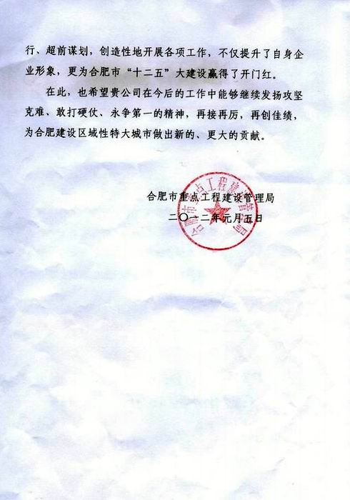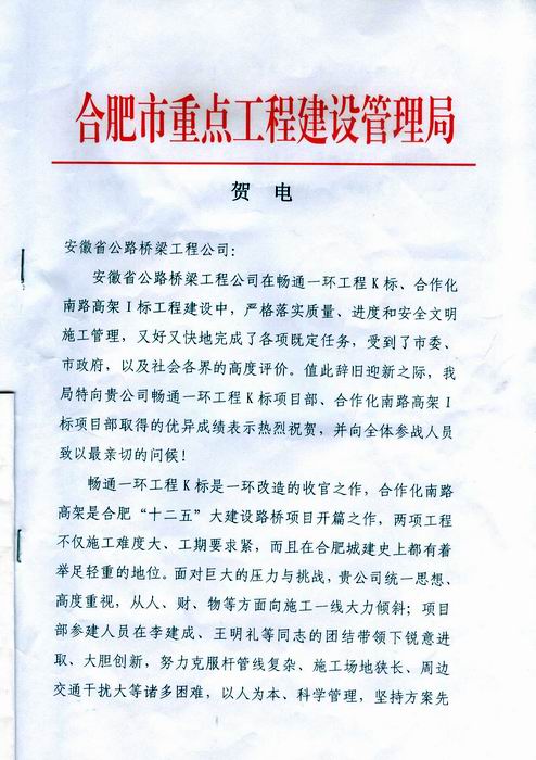 合肥市重點局發(fā)賀電對公司在市政建設中的優(yōu)異成績表示祝賀