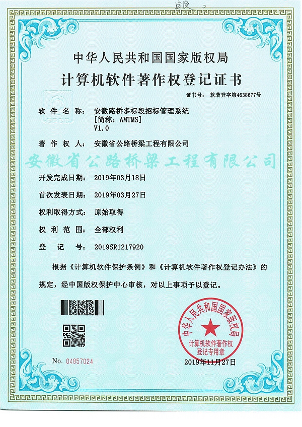 近日,《安徽路橋多標(biāo)段招標(biāo)管理系統(tǒng)V1.0》《安徽路橋關(guān)鍵績效考核管理系統(tǒng)V1.0》等五項管理系統(tǒng)取得國家版權(quán)局頒發(fā)的計算機軟件著作權(quán)。