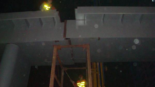 晚上21:30,運梁車準(zhǔn)時將A梁運達(dá)施工區(qū),隨即北一環(huán)南側(cè)在交警的協(xié)助下,按計劃全封閉。經(jīng)過近一個多小時的安裝,晚上23:00整,張洼路天橋施工區(qū)響起了一陣陣掌聲,禮炮隨后騰空燃起——A梁成功安裝了。B梁在隨后的3個小時內(nèi)也成功完成安裝。