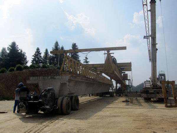為確保架梁施工安全,我部精心制訂施工方案。同時(shí),在架梁機(jī)械驗(yàn)收合格后多次對(duì)其進(jìn)行檢查,對(duì)作業(yè)人員進(jìn)行班前教育,做好交底,制定應(yīng)急預(yù)案,保證了整個(gè)架梁過程安全、高效。隨著架橋機(jī)有節(jié)奏的完成一項(xiàng)項(xiàng)動(dòng)作,襯墊、落勾、試吊、起吊、推進(jìn),在一串協(xié)調(diào)而又連貫的運(yùn)作之后,金字牌大橋第一片梁板穩(wěn)穩(wěn)降落在它發(fā)揮作用的位置上。第一片梁的成功架設(shè),拉開了我標(biāo)段橋梁上部結(jié)構(gòu)施工的序幕,為加快實(shí)現(xiàn)年度建設(shè)目標(biāo)邁出了堅(jiān)實(shí)的一步。