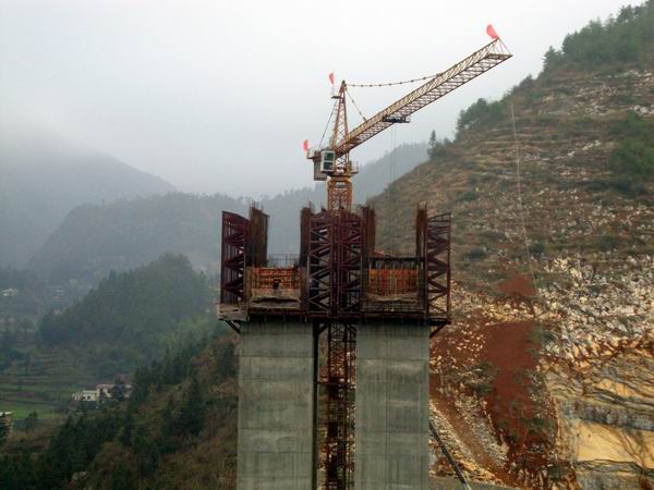 巖子腳特大橋是目前我公司施工歷史上最大跨徑的橋梁。本次澆注的是高達74米的4號主墩的左幅0#塊,設計長度13米,梁高10.5米,梁寬10米。在如此高墩上進行施工也是公司從沒有過的,0#塊施工更是橋梁施工關鍵技術所在,其難度和安全風險可想而知。