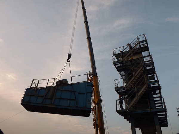 G205改建路面項(xiàng)目完成拌和站主樓吊裝 發(fā)布時(shí)間:2013年07月19日 來源:G205改建路面項(xiàng)目 發(fā)布人: 作者:楊艷峰 瀏覽:2720次 7月17日下午3時(shí),伴隨著響聲震天的鞭炮聲,兩輛大型吊車在安全技術(shù)人員和作業(yè)人員的通力協(xié)作下,安全有序地進(jìn)行拌和站主樓的吊裝。經(jīng)過全體施工人員的努力,于當(dāng)日下午6時(shí)30分完成拌和站主樓的吊裝。
