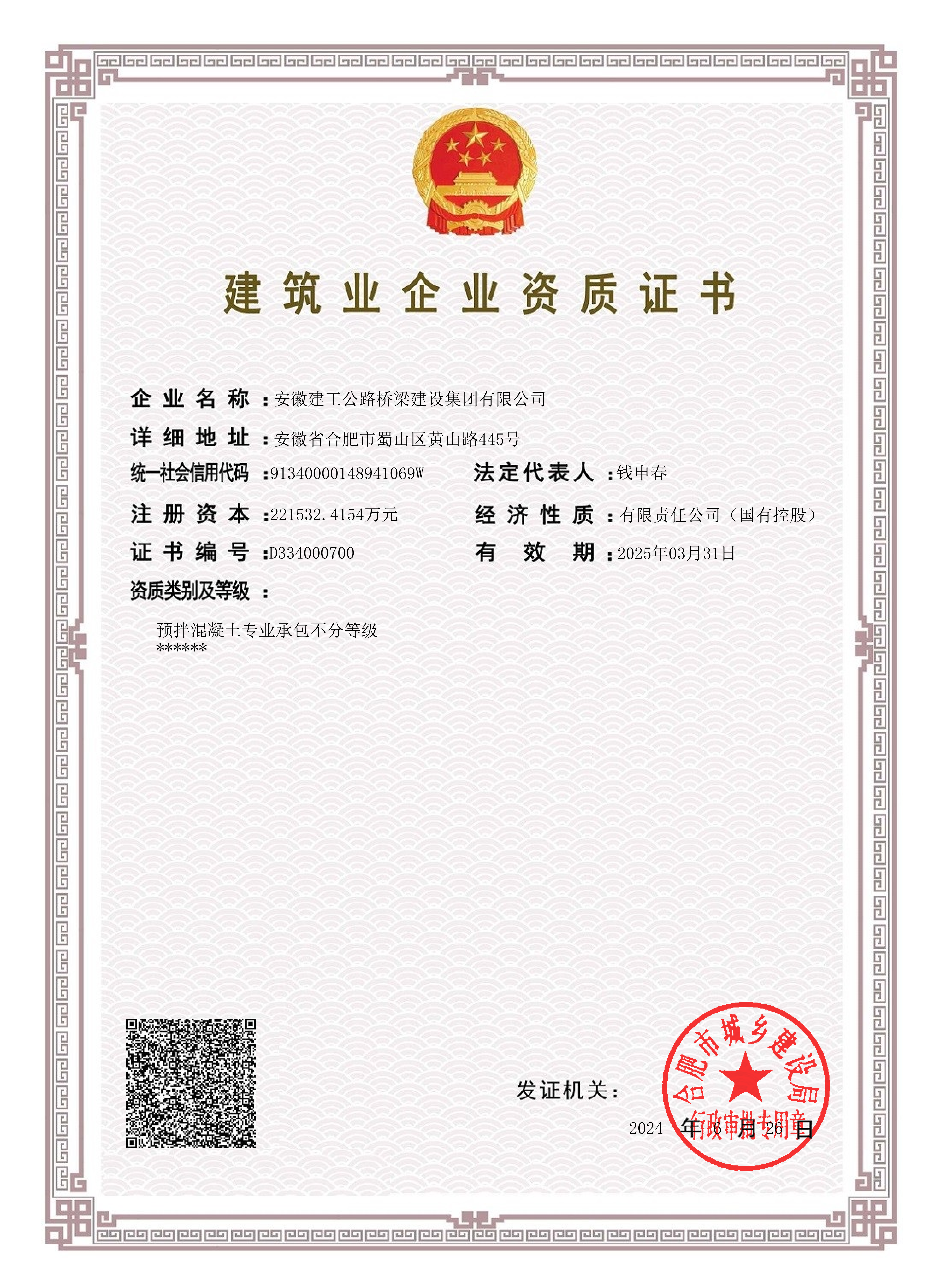 隧道工程專業(yè)承包壹級、城市及道路照明工程專業(yè)承包壹級、地基基礎(chǔ)工程專業(yè)承包壹級、環(huán)保工程專業(yè)承包壹級、橋梁工程專業(yè)承包壹級、市政公用工程施工總承包壹級、建筑工程施工總承包壹級、鋼結(jié)構(gòu)工程專業(yè)承包壹級、建筑裝修裝飾工程專業(yè)承包壹級