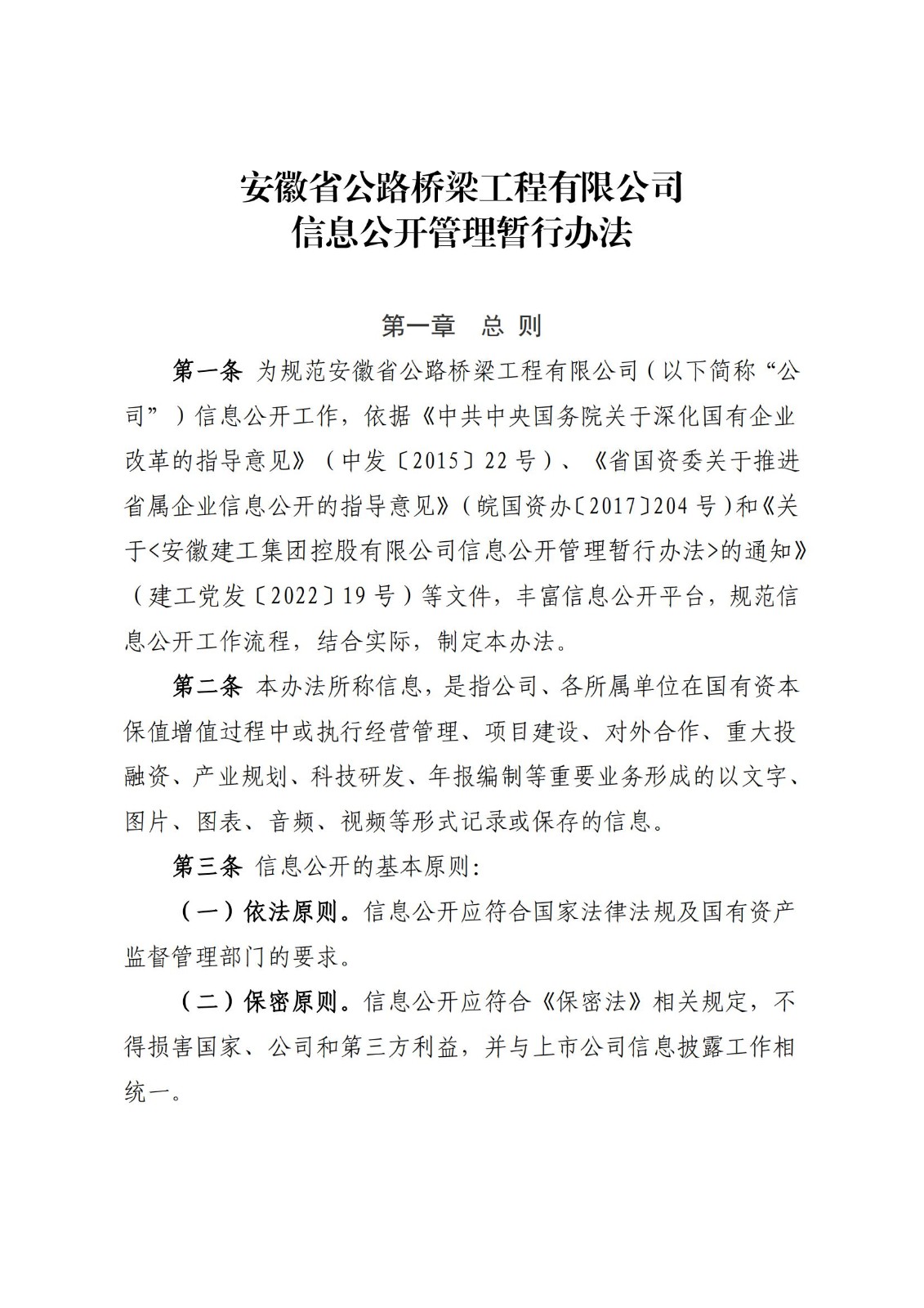 安徽建工公路橋梁建設(shè)集團(tuán)有限公司信息公開暫行管理辦法 發(fā)布時間:2022年11月20日 來源:安徽路橋公司 發(fā)布人:黨委工作部 作者:安徽路橋公司 瀏覽:8812次