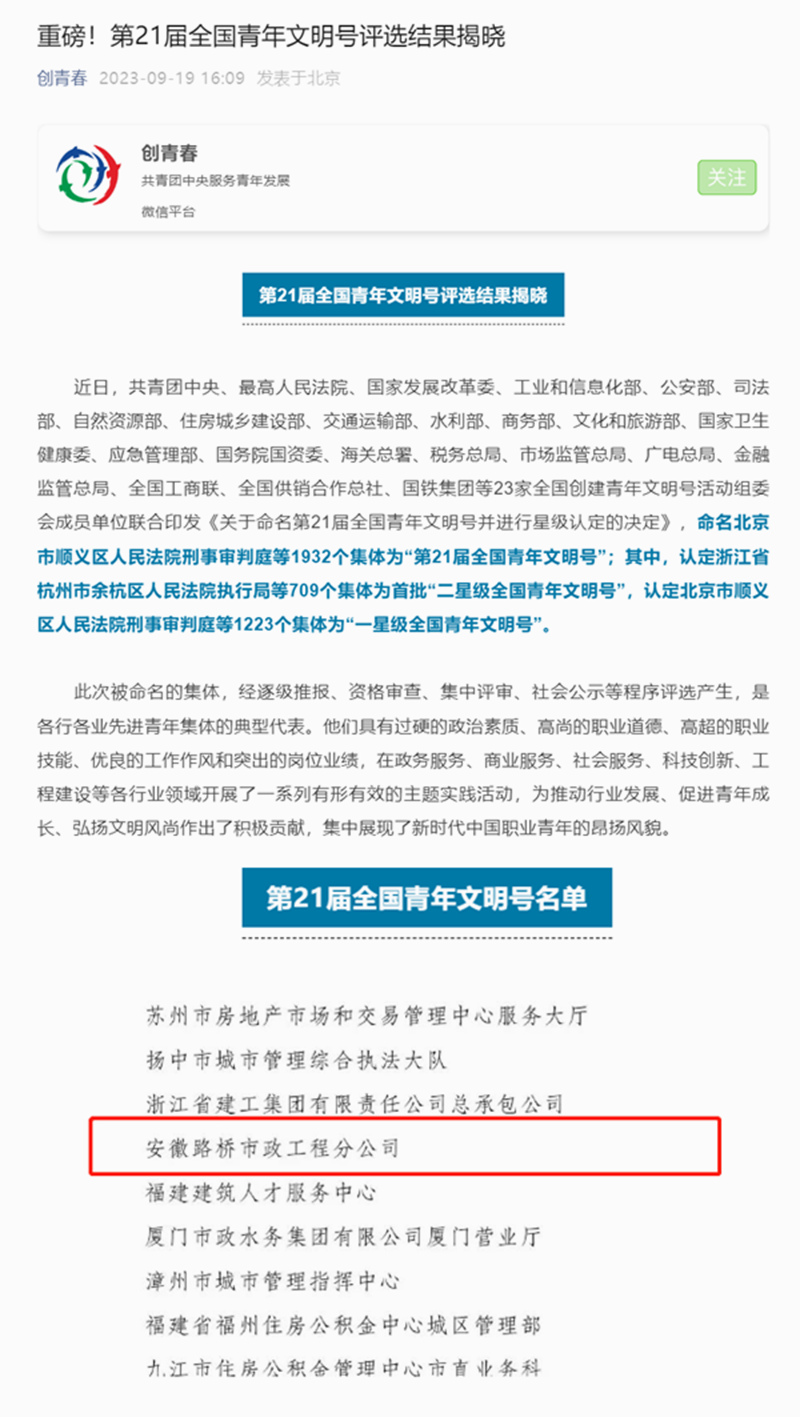 9月19日,共青團中央、住房城鄉(xiāng)建設(shè)部等23家全國創(chuàng)建青年文明號活動組委會成員單位聯(lián)合印發(fā)《關(guān)于命名第21屆全國青年文明號并進行星級認定的決定》,發(fā)布“第21屆全國青年文明號”獲評名單。安徽路橋市政分公司榮耀登榜,是繼榮獲“2017-2018年度全國青年文明號”之后再次獲此殊榮,同時被認定為首批“二星級全國青年文明號”。