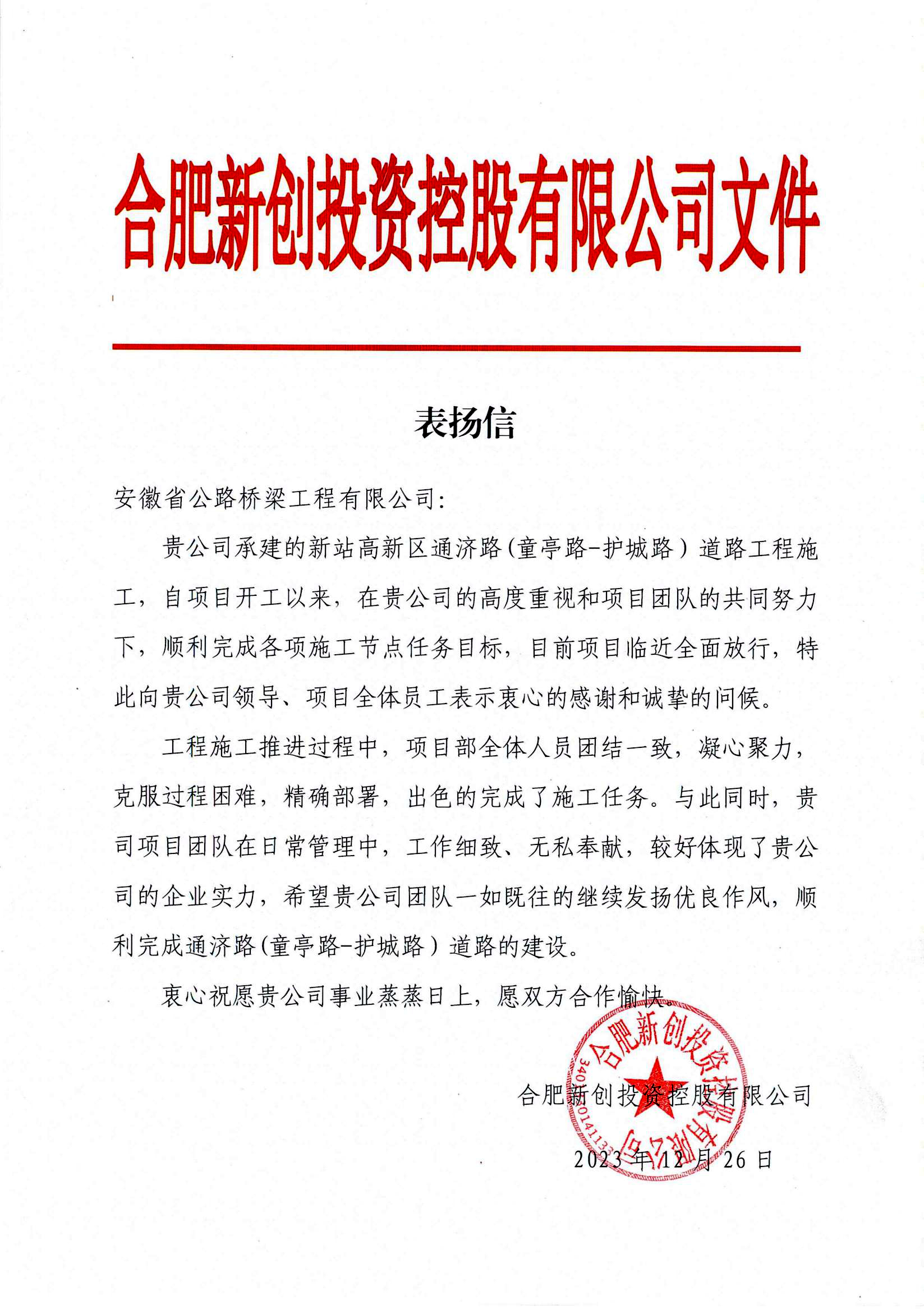 合肥新創(chuàng)投資控股有限公司來信表示,新站高新區(qū)通濟(jì)路(童亭路-護(hù)城路)道路工程施工推進(jìn)過程中,項(xiàng)目團(tuán)隊(duì)發(fā)揚(yáng)路橋鐵軍優(yōu)良作風(fēng),咬定目標(biāo)攻堅(jiān)克難,持續(xù)加強(qiáng)現(xiàn)場安全文明施工和質(zhì)量管理,圓滿完成各項(xiàng)施工任務(wù),彰顯了國企腳踏實(shí)地、久久為功的擔(dān)當(dāng)作風(fēng)。