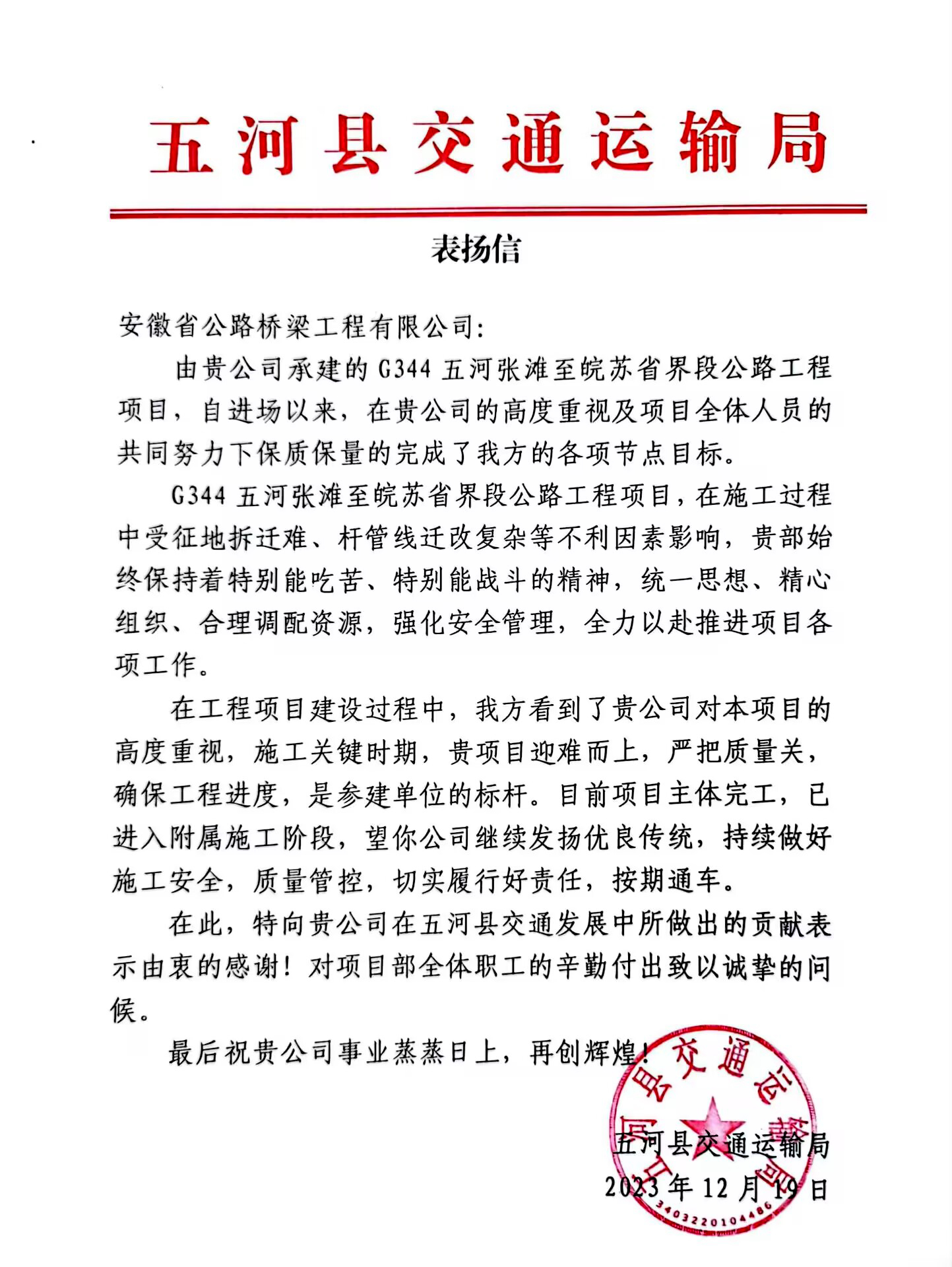五河縣交通運(yùn)輸局來信指出,G344五河張灘至皖蘇省界段公路工程自進(jìn)場以來,項(xiàng)目全體參建人員統(tǒng)一思想、精心組織、合理調(diào)配資源,克服了征地拆遷難、桿管線遷改復(fù)雜等不利因素影響,保質(zhì)保量地完成了各項(xiàng)節(jié)點(diǎn)目標(biāo),是全線參建單位的標(biāo)桿。