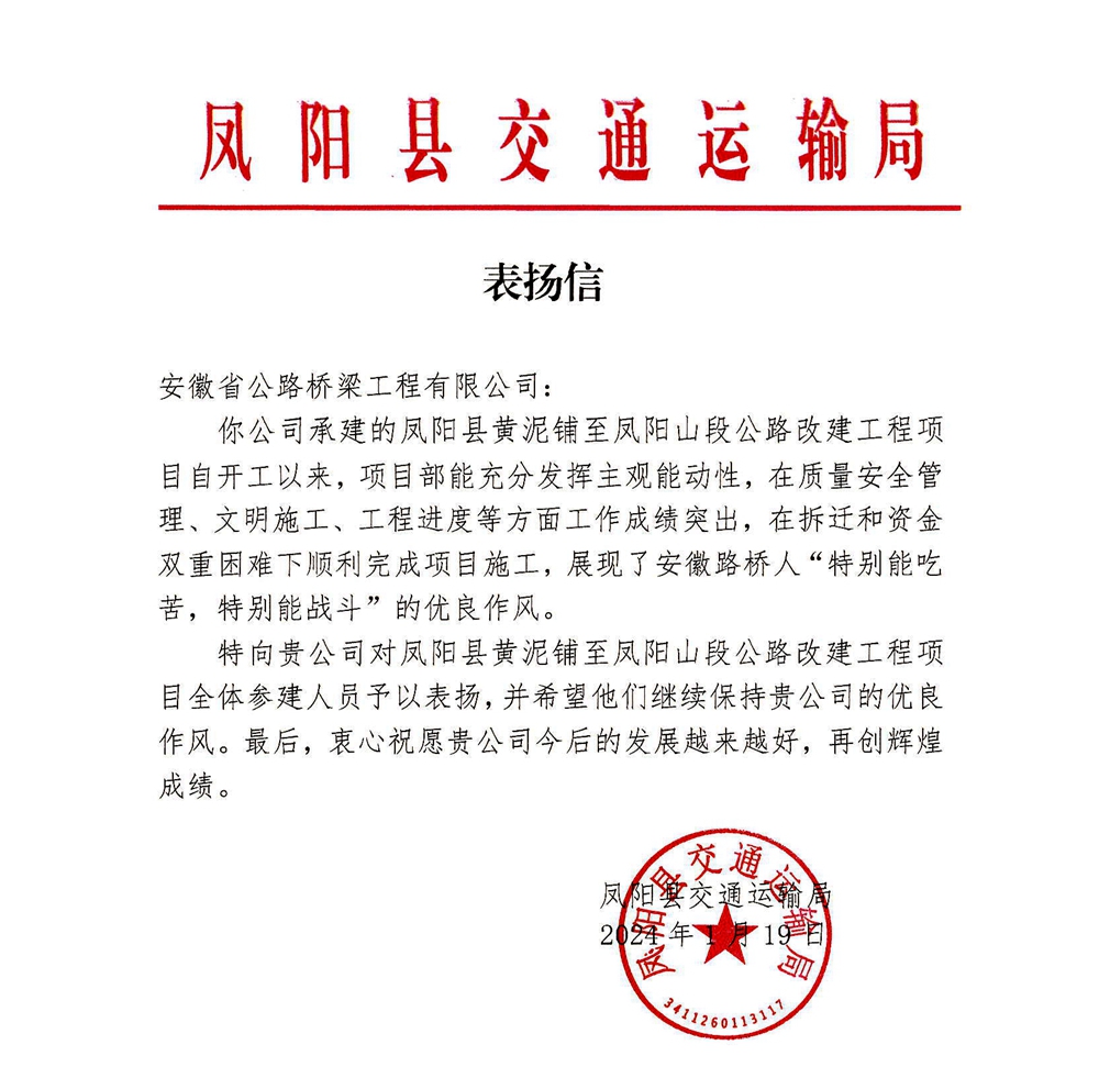 鳳陽縣交通運(yùn)輸局來信表示,鳳臺縣黃鳳公路改建工程項(xiàng)目團(tuán)隊(duì)發(fā)揮主觀能動性,在質(zhì)量安全管理、文明施工、工程進(jìn)度等方面工作成績突出,充分發(fā)揚(yáng)了安徽路橋“特別能吃苦、特別能戰(zhàn)斗”的企業(yè)作風(fēng)。