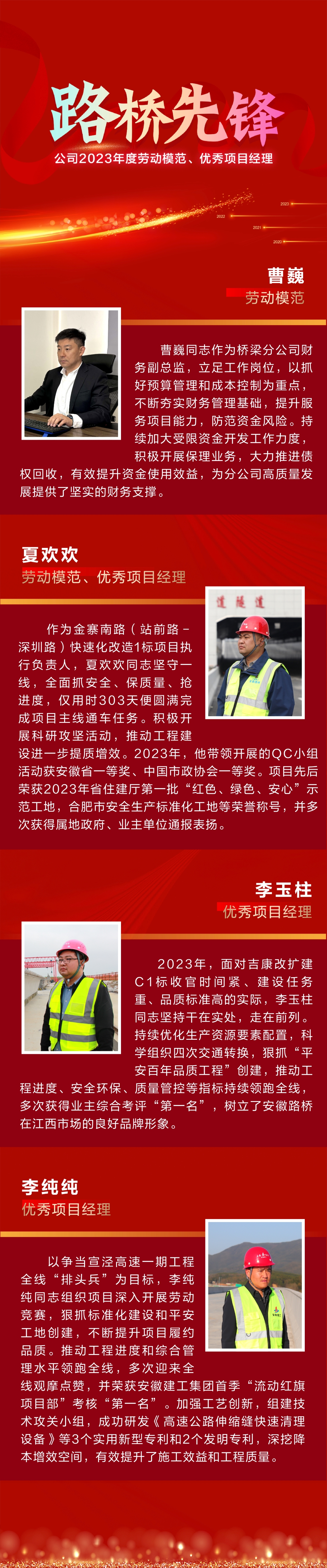 【路橋先鋒】公司2023年度勞動(dòng)模范、優(yōu)秀項(xiàng)目經(jīng)理風(fēng)采展示③ 發(fā)布時(shí)間:2024年03月20日 來源:黨委組織部(人力資源部、黨委宣傳部)、所屬各單位 發(fā)布人:黨委組織部(人力資源部、黨委宣傳部) 作者: 瀏覽:2341次