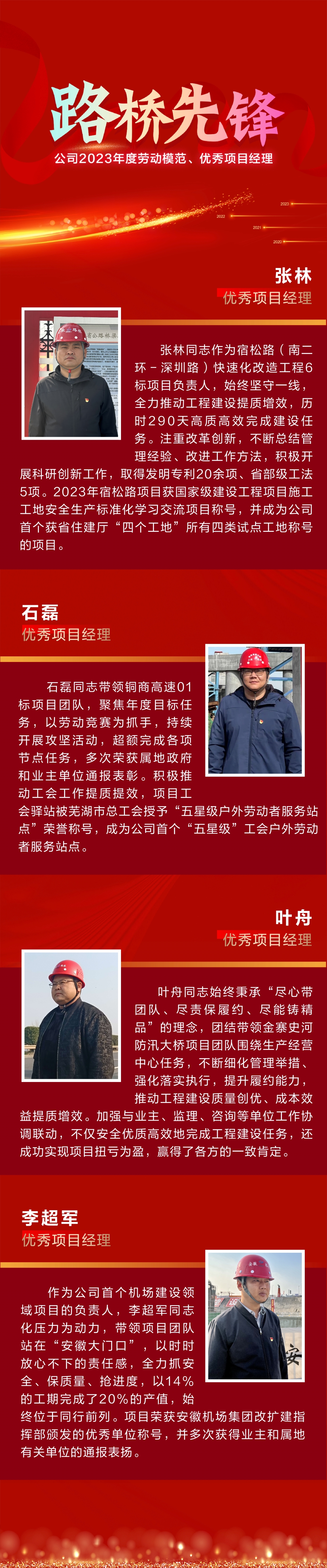 【路橋先鋒】公司2023年度勞動(dòng)模范、優(yōu)秀項(xiàng)目經(jīng)理風(fēng)采展示④ 發(fā)布時(shí)間:2024年03月21日 來源:黨委組織部(人力資源部、黨委宣傳部)、所屬各單位 發(fā)布人:黨委組織部(人力資源部、黨委宣傳部) 作者: 瀏覽:2222次