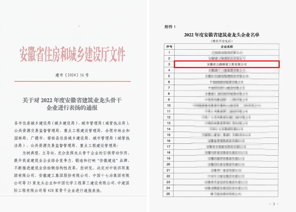 近日,安徽省住房和城鄉(xiāng)建設(shè)廳發(fā)文,對安徽路橋等25家2022年度安徽省建筑業(yè)龍頭企業(yè)和428家骨干企業(yè)進(jìn)行了通報表揚(yáng)。