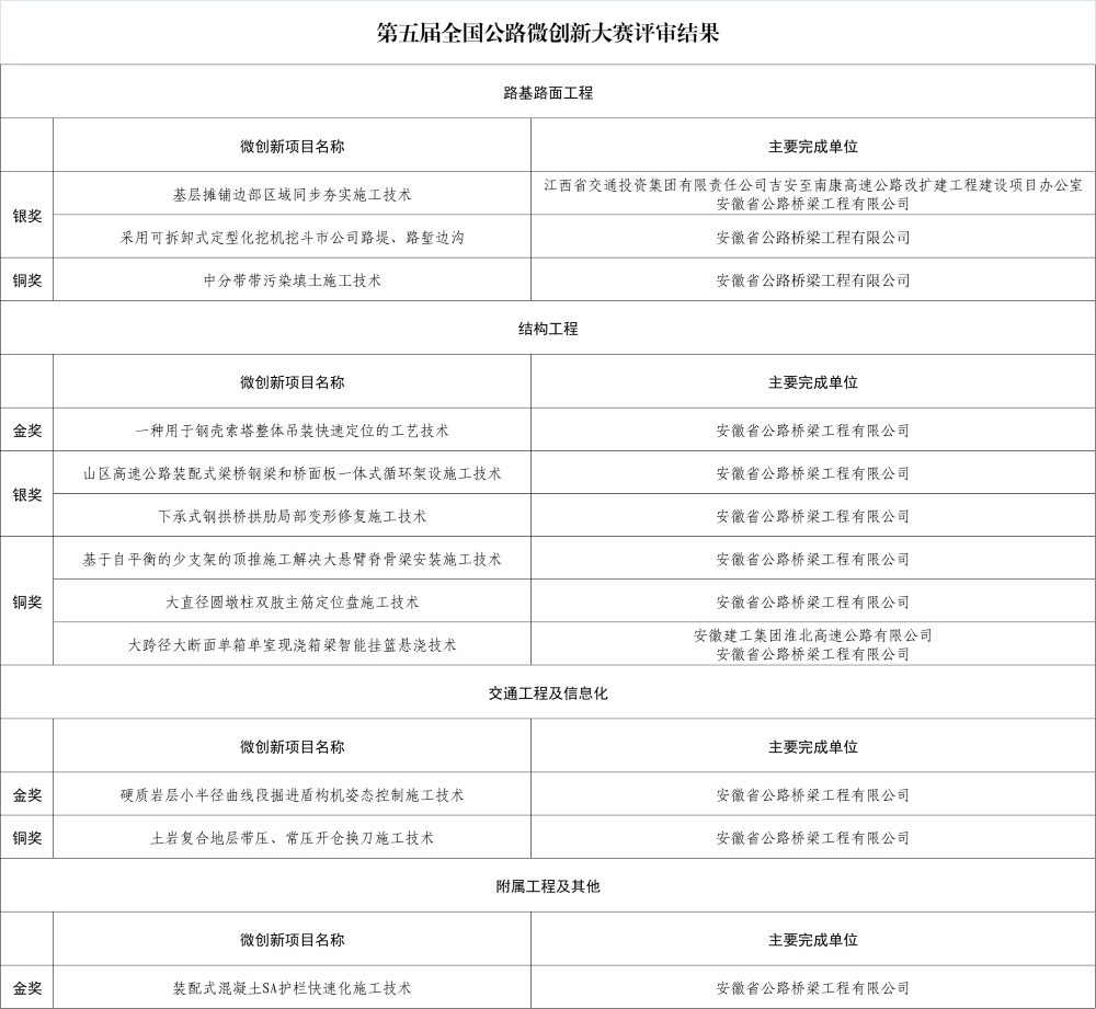近日,中國公路學(xué)會(huì)公布了第五屆全國公路微創(chuàng)新大賽評審結(jié)果,公司《一種用于鋼殼索塔整體吊裝快速定位的工藝技術(shù)》《采用可拆卸式定型化挖機(jī)挖斗施工路堤、路塹邊溝》《中分帶無污染填土施工技術(shù)》等十余項(xiàng)微創(chuàng)新成果在眾多參賽項(xiàng)目中脫穎而出,分別榮獲金獎(jiǎng)、銀獎(jiǎng)、銅獎(jiǎng)。