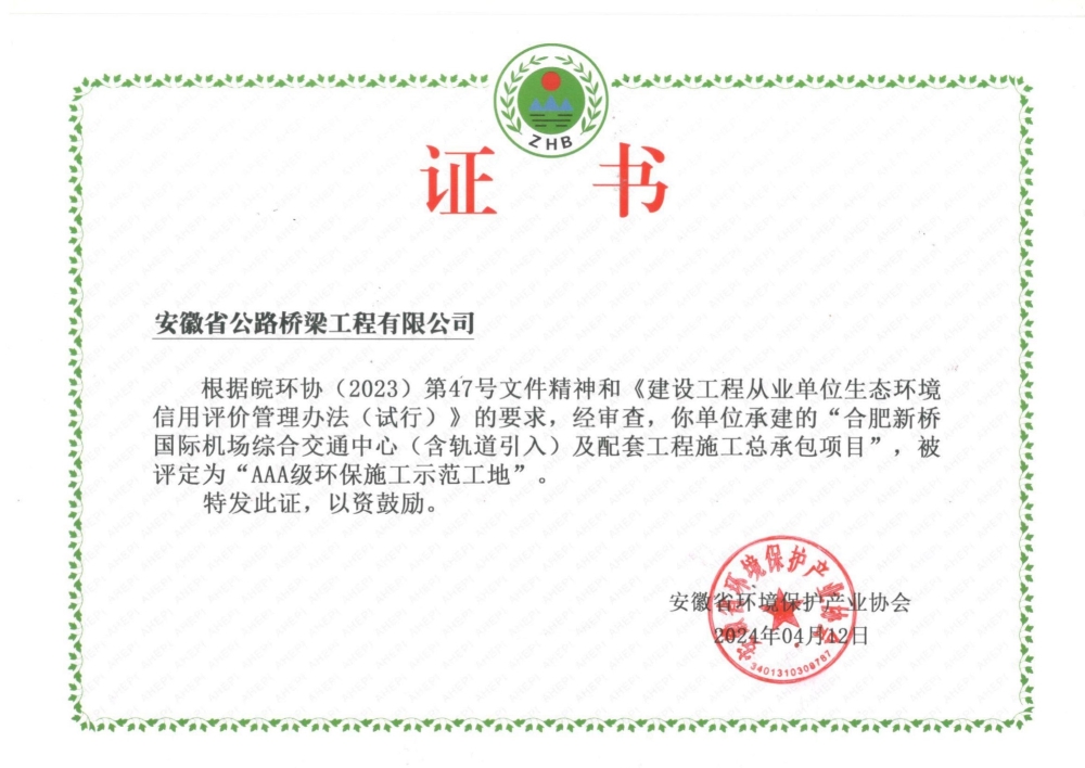 近日,安徽省環(huán)境保護(hù)產(chǎn)業(yè)協(xié)會公布了“2024年第2批建設(shè)工程從業(yè)單位生態(tài)環(huán)境信用評價結(jié)果”,由公司承建的徐州至淮北至阜陽高速公路淮北段路基路面標(biāo)、G329孫埠至大汪村段一級公路改建工程和合肥新橋國際機(jī)場綜合交通中心(含軌道引入)及配套工程施工總承包項目獲評安徽省“AAA級環(huán)保施工示范工地”稱號。