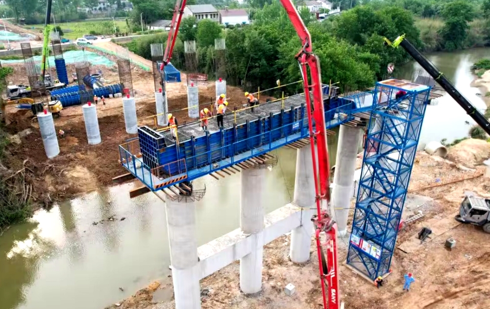 S22天天高速YQB2標(biāo)施工現(xiàn)場(chǎng)一片繁忙,5個(gè)施工班組、10余套大型機(jī)械、100名施工工人正在施工作業(yè),上立柱混凝土澆筑、蓋梁現(xiàn)澆等多個(gè)工序同步進(jìn)行,爭(zhēng)取在在汛期來(lái)臨前撤離河道,為下一步梁板架設(shè)創(chuàng)造有利條件。