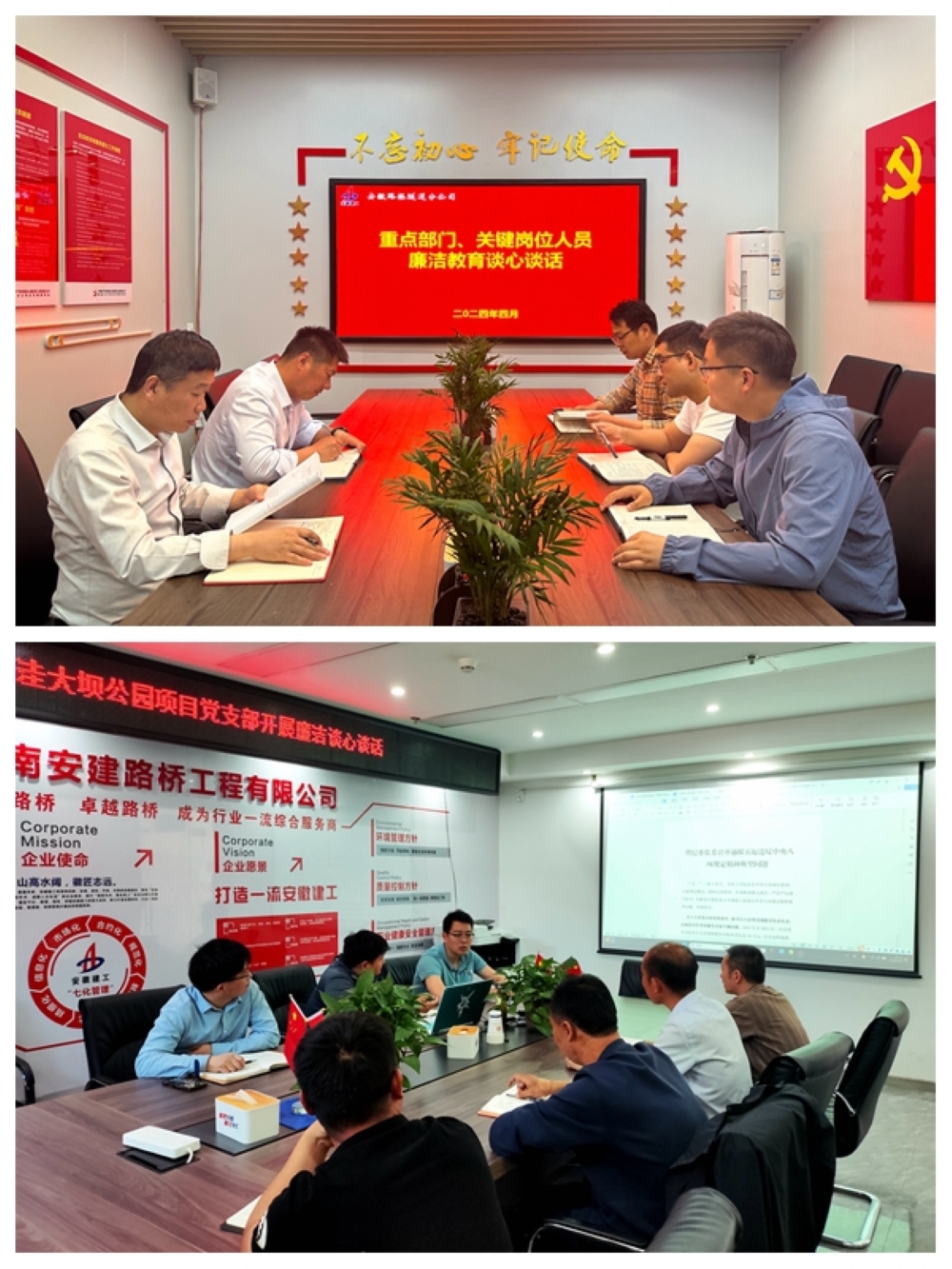 分公司機關黨支部、湯洼大壩公園項目黨支部組織開展談心談話廉潔教育,結(jié)合近年來中央紀委國家監(jiān)委通報的違紀違法典型案例,要求職工強化嚴于律己做人、清正廉潔做事的責任擔當,在工作和生活中守住廉潔自律“準繩”。