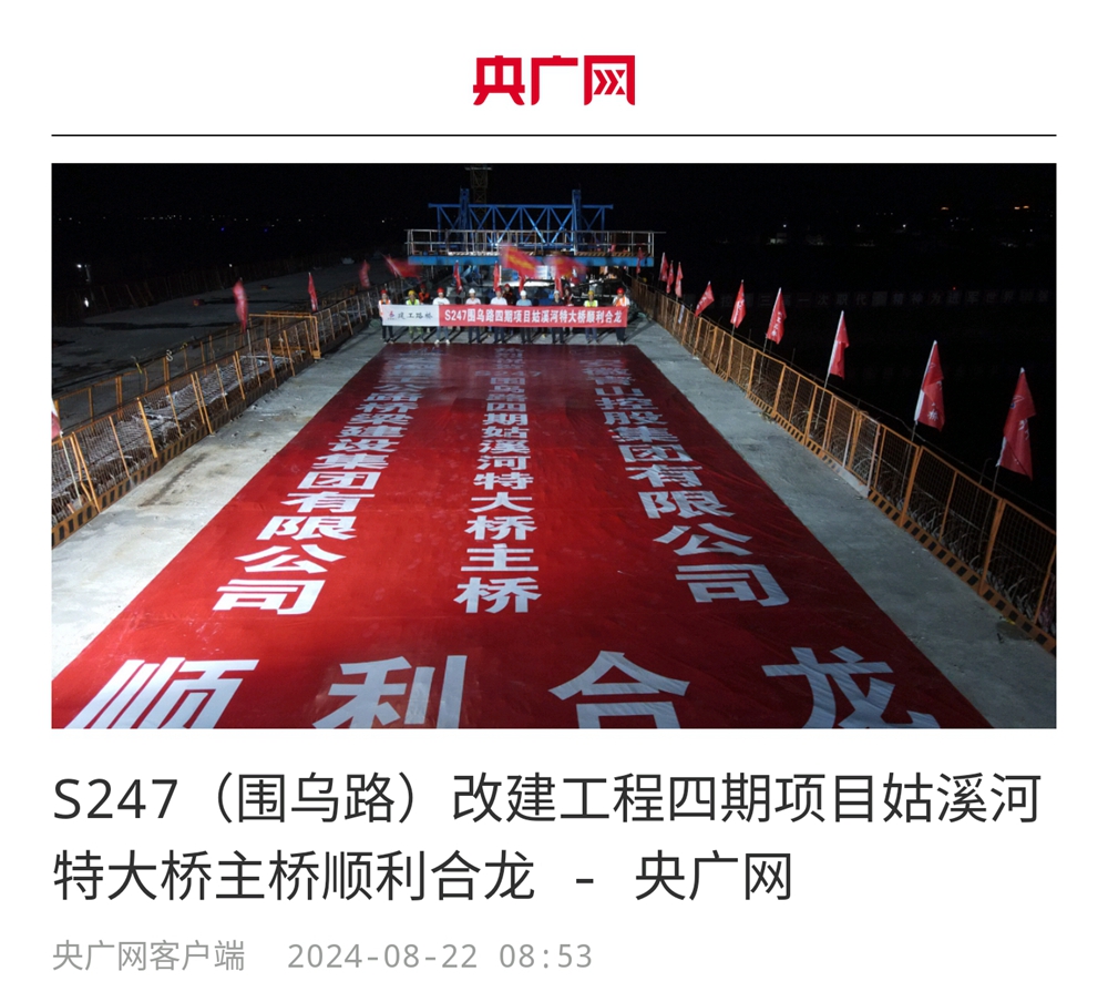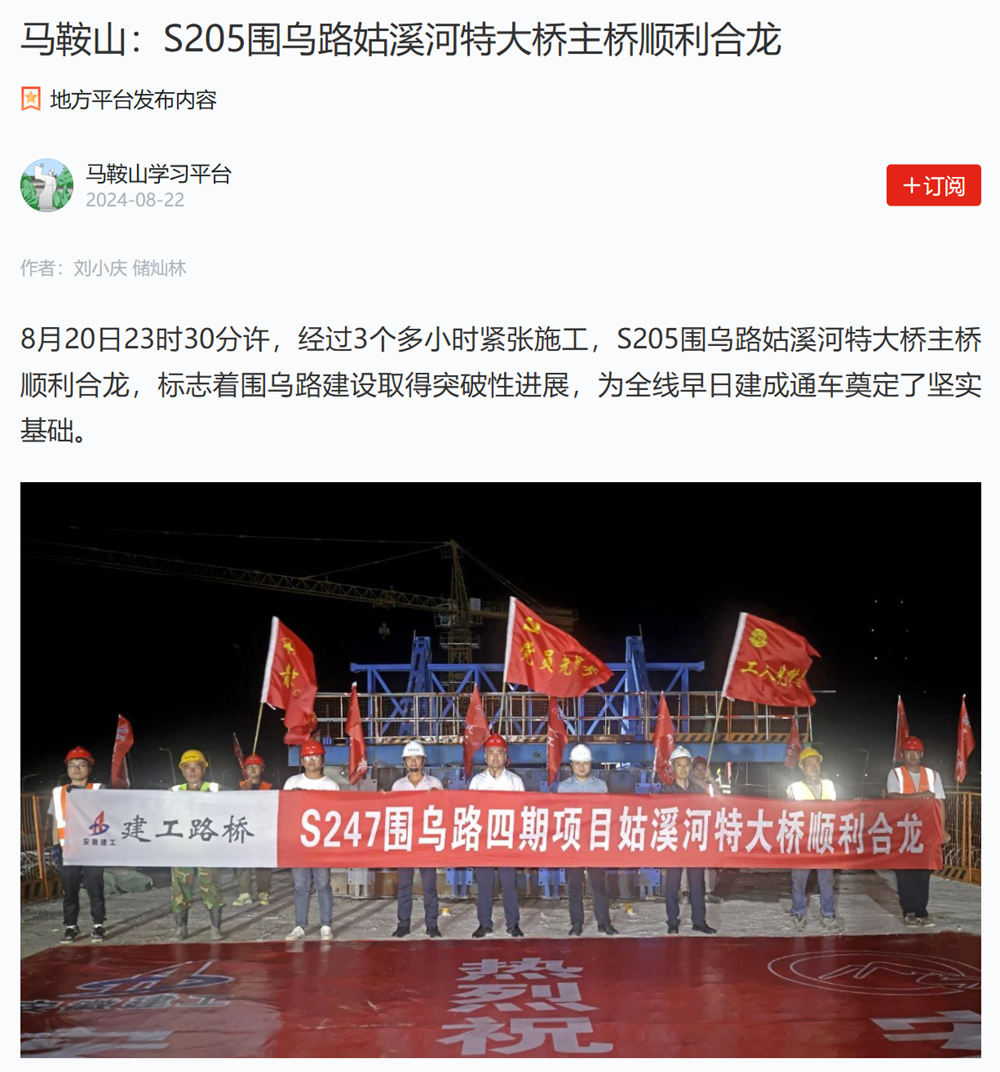 【名媒聚焦】央廣網(wǎng)、學(xué)習(xí)強(qiáng)國(guó)等主流媒體聚焦S247(圍烏路)改建工程四期姑溪河特大橋主橋順利合龍
