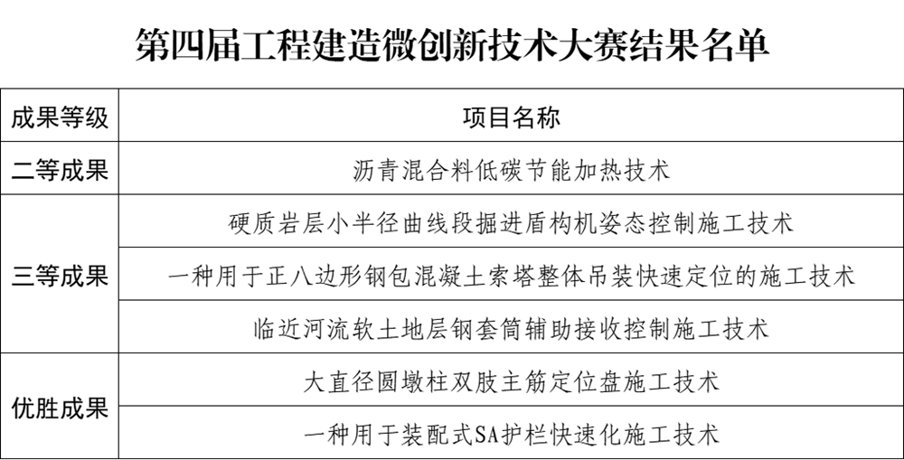 近日,中國施工企業(yè)管理協(xié)會公布第四屆工程建造微創(chuàng)新技術(shù)大賽結(jié)果,經(jīng)形式審查、初賽、復(fù)賽、決賽等環(huán)節(jié)的角逐,公司《瀝青混合料低碳節(jié)能加熱技術(shù)》等6個(gè)項(xiàng)目分別榮獲二等成果、三等成果和優(yōu)勝成果。