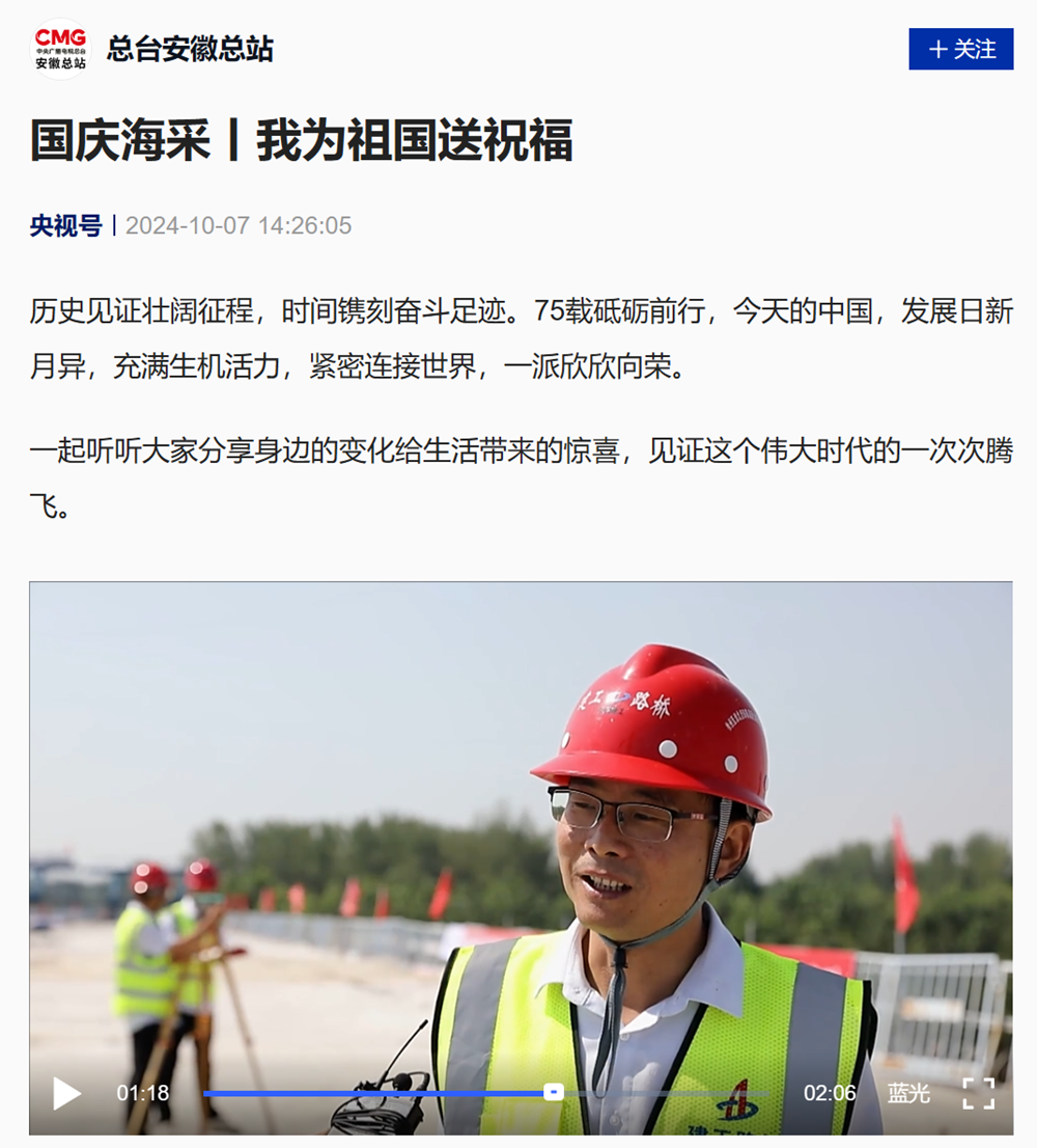 10月7日,中央廣播電視總臺CCTV4-中文國際頻道《中國新聞》欄目、央視新聞、央視頻客戶端對公司承建的徐淮阜高速淮北段項目國慶假期“不打烊”推進工程建設情況進行了報道。