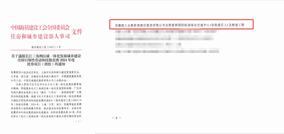 合肥新橋國(guó)際機(jī)場(chǎng)綜合交通中心項(xiàng)目榮獲長(zhǎng)江三角洲區(qū)域一體化發(fā)展城鄉(xiāng)建設(shè)全國(guó)引領(lǐng)性勞動(dòng)和技能競(jìng)賽2024年度優(yōu)秀項(xiàng)目