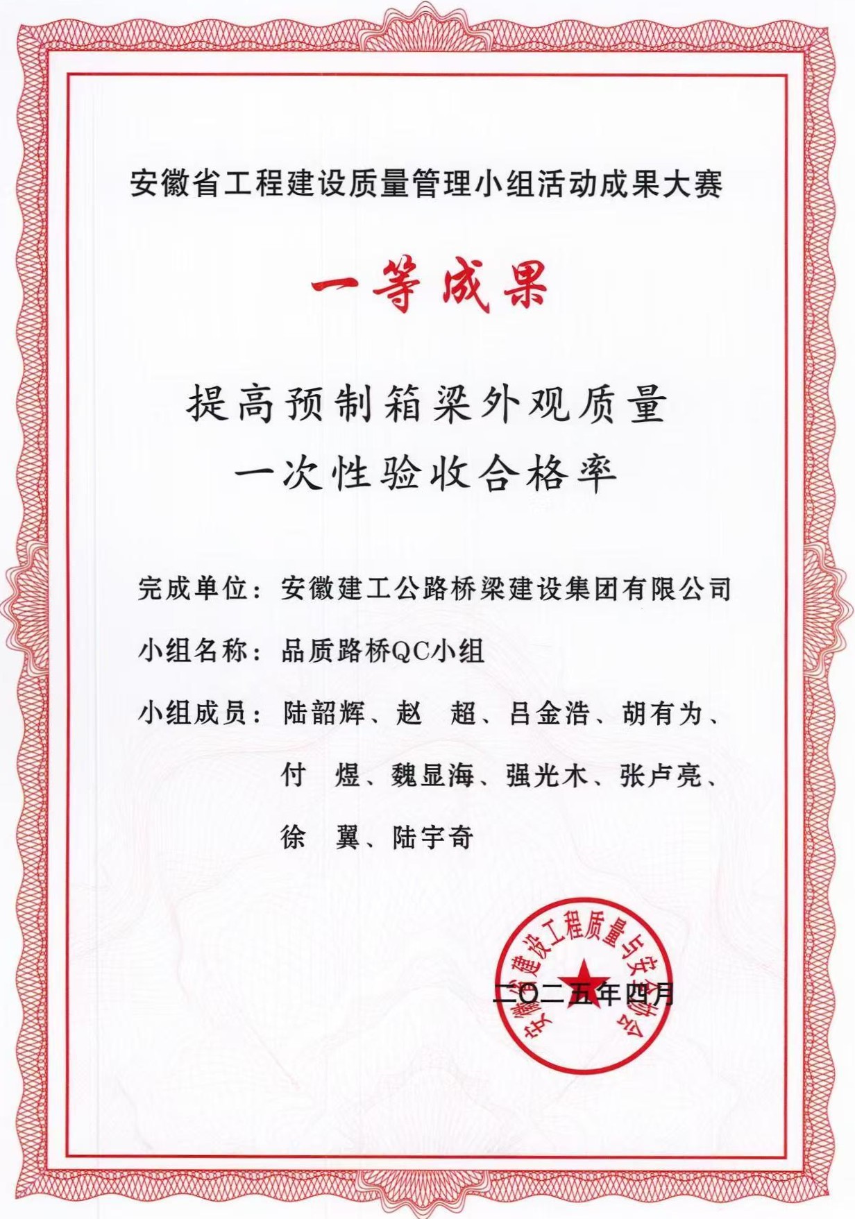 黨支部牽頭組建“品質(zhì)路橋”QC小組,聚焦預(yù)制箱梁外觀質(zhì)量痛點(diǎn),對材料管理實(shí)行原材料進(jìn)場雙檢,針對性開展關(guān)鍵材料性能試驗(yàn);預(yù)制工藝嚴(yán)控模板拼裝精度,優(yōu)化混凝土振搗方式。改進(jìn)后,預(yù)制箱梁外觀合格率從89.67%提升至95.44%,每片修飾時(shí)間縮短2小時(shí)。成果《提高預(yù)制箱梁外觀質(zhì)量一次驗(yàn)收合格率》獲安徽省QC成果一等獎(jiǎng),以“紅色匠心”護(hù)航工程品質(zhì)。