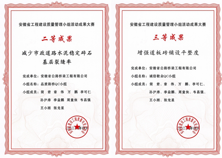 創(chuàng)新課題“積微成著”。憑借不同環(huán)境下的路基路面施工實踐,項目團(tuán)隊持續(xù)開展技術(shù)攻堅和經(jīng)驗萃取。在路面基層施工階段,通過嚴(yán)格控制石粉含泥量,成功避免水穩(wěn)碎石基層裂縫,基層壓實度全面控制在96%以上;在附屬結(jié)構(gòu)施工中,項目團(tuán)隊對人行道板磚使用及鋪設(shè)進(jìn)行改良,提升了路面觀感和行走舒適度。這些源于項目一線的創(chuàng)新案例,不僅提升了項目的建設(shè)質(zhì)量和效率,更為后續(xù)的項目建設(shè)提供了寶貴的經(jīng)驗借鑒。相關(guān)QC成果在安徽省建設(shè)質(zhì)量管理小組成果大賽中分別獲得二等獎和三等獎。