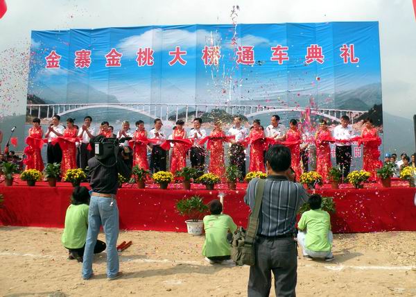 金寨縣委書(shū)記沙洪虎在講話中高度贊揚(yáng)了我公司講政治、重大局、作奉獻(xiàn)的精神。省公路局秦勤局長(zhǎng)在代表梅勁廳長(zhǎng)的講話中指出,金桃大橋的建成具有極為重要的政治、經(jīng)濟(jì)意義,大橋在施工中填補(bǔ)了省內(nèi)橋梁施工技術(shù)的數(shù)項(xiàng)空白,該橋建成后將大大改善當(dāng)?shù)貒?yán)重落后的交通狀況,對(duì)促進(jìn)當(dāng)?shù)氐慕?jīng)濟(jì)發(fā)展,提高人民群眾生活水平,造福老區(qū)人民具有極其重要的意義。