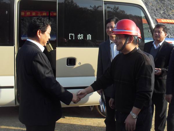 黃省長(zhǎng)首先在施工現(xiàn)場(chǎng)聽(tīng)取了績(jī)黃高速項(xiàng)目辦主任方昱對(duì)于工程建設(shè)情況的匯報(bào)。聽(tīng)完匯報(bào)后,黃省長(zhǎng)對(duì)公司和項(xiàng)目部的工作給予充分肯定和高度評(píng)價(jià)。他說(shuō),“省路橋公司是本省施工的龍頭企業(yè),代表本省的形象,希望你們?cè)俳釉賲?,繼續(xù)做好規(guī)范化施工,高效管理,抓住當(dāng)前機(jī)遇,努力打造優(yōu)質(zhì)工程,不斷提升企業(yè)形象,開(kāi)辟新的市場(chǎng),繼續(xù)做大做強(qiáng)?!蓖艨偙響B(tài),“省路橋公司在黃省長(zhǎng)的關(guān)懷下,近年來(lái)企業(yè)改制改革方面取得了一定成效,企業(yè)取得了巨大發(fā)展,我們將繼續(xù)做好施工規(guī)范化、精細(xì)化管理,在省領(lǐng)導(dǎo)的關(guān)心與支持下,我們一定會(huì)抓住機(jī)遇、迎接挑戰(zhàn),把企業(yè)做大做強(qiáng)”。
