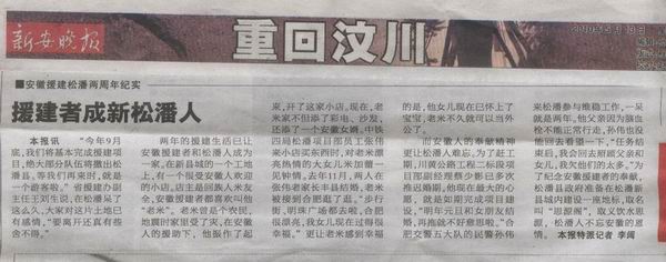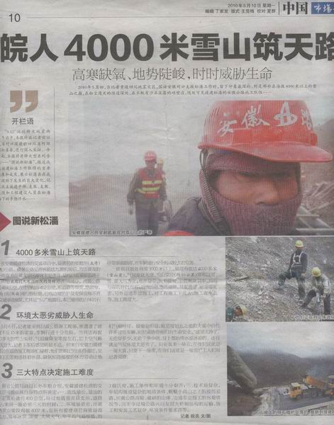 在“5.12”汶川大地震發(fā)生兩周年之際,安徽省路橋公司承建的我省對口援建四川松潘縣項目之一——漳黃公路道路改建工程02標(biāo)再次引起省內(nèi)各大主流媒體的高度關(guān)注。2010512《安徽日報》以專版形式發(fā)表了我省對口支援領(lǐng)導(dǎo)小組副組長、省政府秘書長梁衛(wèi)國文章《合力共建新松潘》,對安徽路橋在施工條件和環(huán)境十分艱苦的情況下表現(xiàn)出來的優(yōu)良政治品格給予了充分肯定。511安徽電視臺第一時間欄目記者在海拔4000以上的施工現(xiàn)場采訪了項目副經(jīng)理蔡少影同志。510《新安晚報》、《安徽市場報》等均以專刊形式報道了公司援建項目。