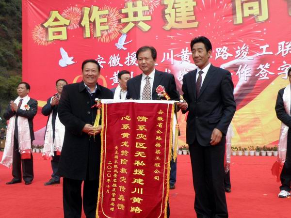 十月的松潘,金風(fēng)送爽,喜事連連。10月14日,安徽援建川黃公路竣工聯(lián)歡會(huì)暨黃山黃龍戰(zhàn)略合作簽字儀式在美麗的黃龍風(fēng)景區(qū)廣場(chǎng)隆重舉行。安徽省政府秘書長梁衛(wèi)國、省交通廳副廳長丁慶領(lǐng)及四川省、阿壩州、松潘縣各級(jí)領(lǐng)導(dǎo)出席儀式。我公司總經(jīng)理汪衛(wèi)東、黨委書記陳光磊以及漳黃02標(biāo)項(xiàng)目經(jīng)理陳莘同志作為特邀嘉賓出席典禮。這標(biāo)志著我安徽路橋?qū)谥г膳苏狞S公路建設(shè)任務(wù)的圓滿完成。