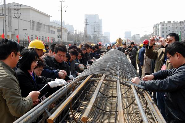 項目辦負責(zé)人向?qū)W員們簡單介紹了工程概況。學(xué)員們在工人師傅的指導(dǎo)下,紛紛戴上手套、拿起工具,給已成型的樁基鋼筋籠綁扎鋼絲,親身體驗了建設(shè)者的辛勞。學(xué)員們虛心向工人師傅學(xué)習(xí),緊圍著鋼筋籠,一邊認真扎絲,一邊相互交流,探討綁扎技巧。在學(xué)員們的巧手下,兩個鋼筋籠很快完成綁扎,將用于晚間施工。