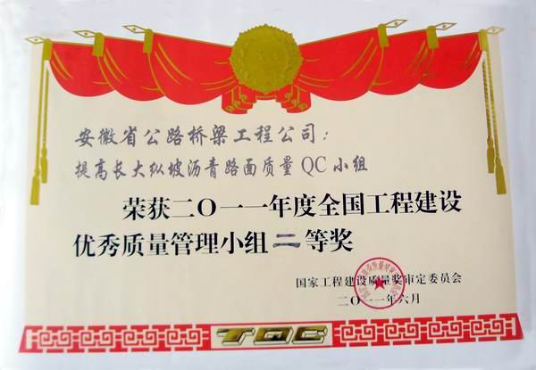 近日從杭州舉辦的2011年度全國工程建設質量管理小組成果發(fā)布會上傳來喜訊,蕪宣養(yǎng)護項目QC質量活動小組在此次成果發(fā)布會取得驕人成績,經過最終評審,我部QC小組課題為《提高長大縱坡瀝青路面質量》的研究榮獲年度全國工程建設質量管理小組二等獎。