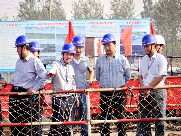 10月15日,安徽交通投資集團董事長喬傳福蒞臨濟祁高速01標淮河特大橋主墩鋼圍堰水下混凝土封底施工現(xiàn)場檢查指導工作。濟祁高速淮合段建設辦主任張其云陪同。